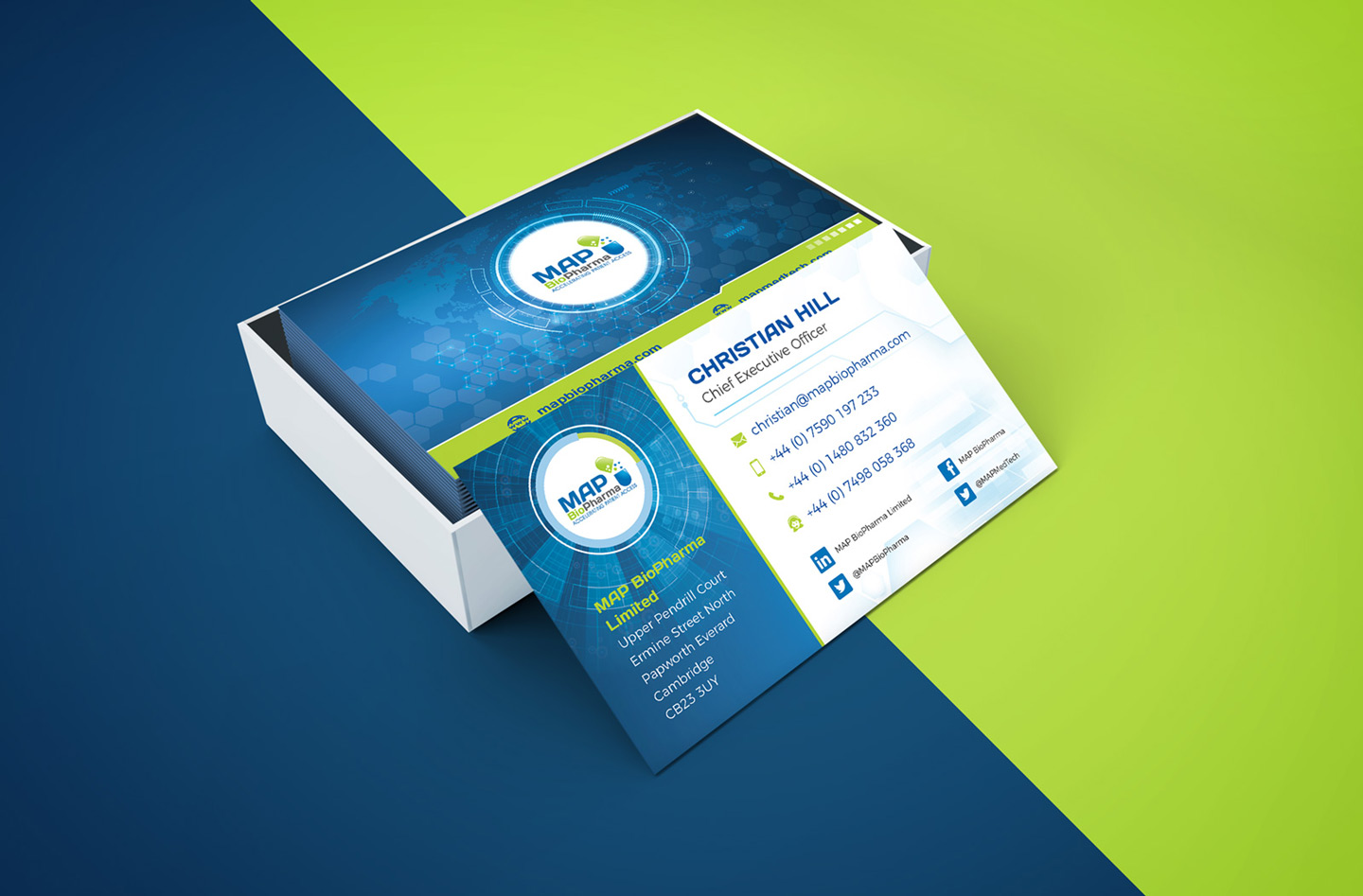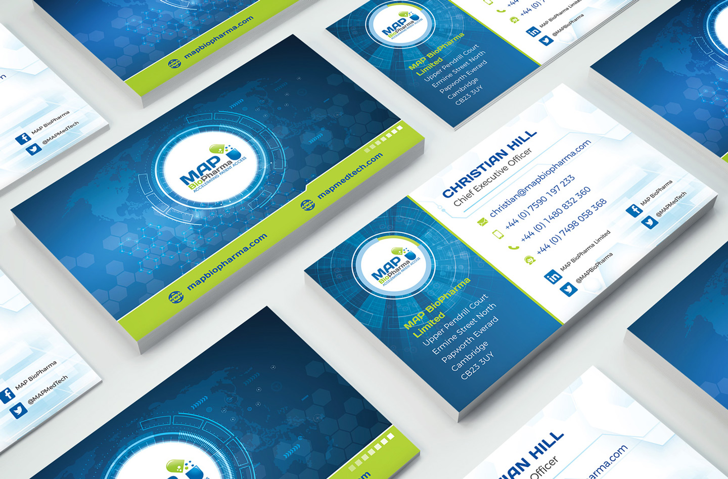 Business card design for MAP BioPharma, the market leader in accelerating patient access to medicines, devices and diagnostics.
