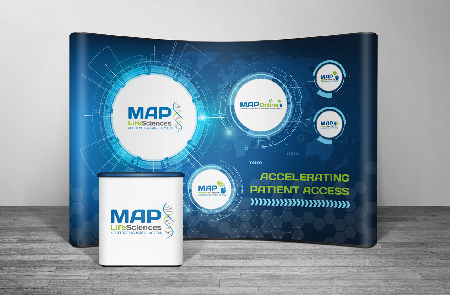 Trade Show exhibition stand design for MAP BioPharma, the market leader in accelerating patient access to medicines, devices and diagnostics.